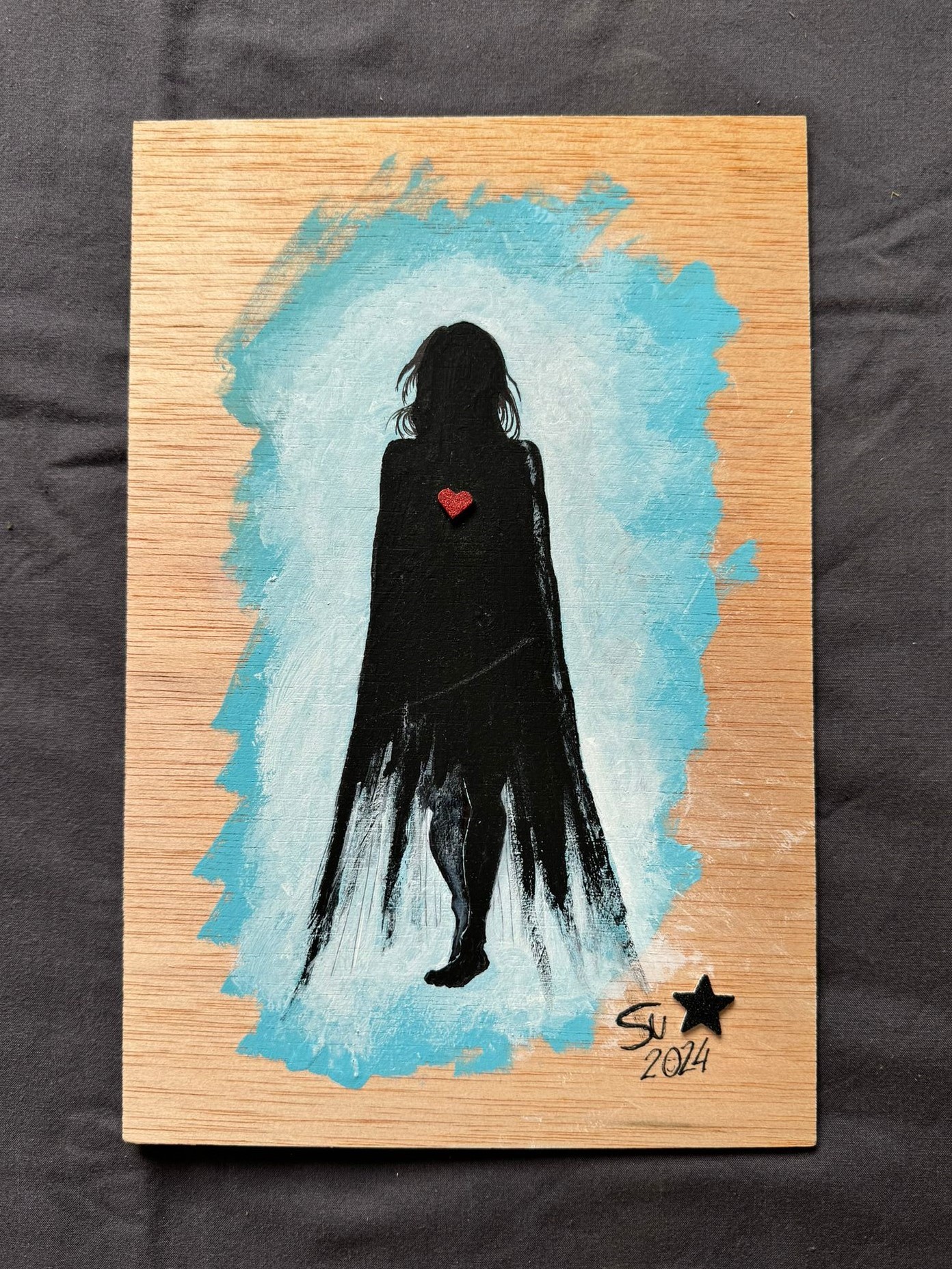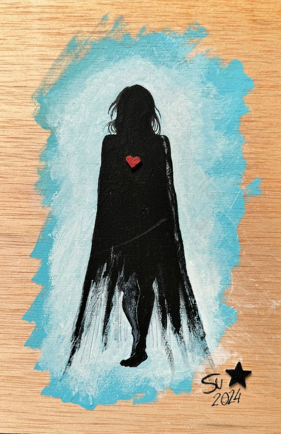 Las sombras no siempre son oscuras, a veces también son protectoras. Esta figura femenina, envuelta en sombras pero con un corazón que brilla, es un símbolo de resiliencia. En los momentos más difíciles, es cuando más brillamos, cuando más nos encontramos con nuestra propia luz interior.
